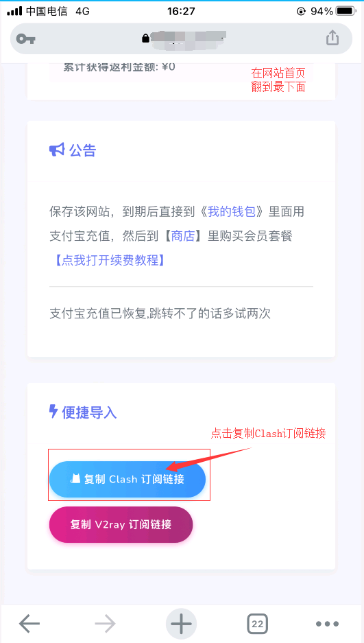 第三步:在官网首页 复制Clash订阅链接 然后粘贴到Clash软件