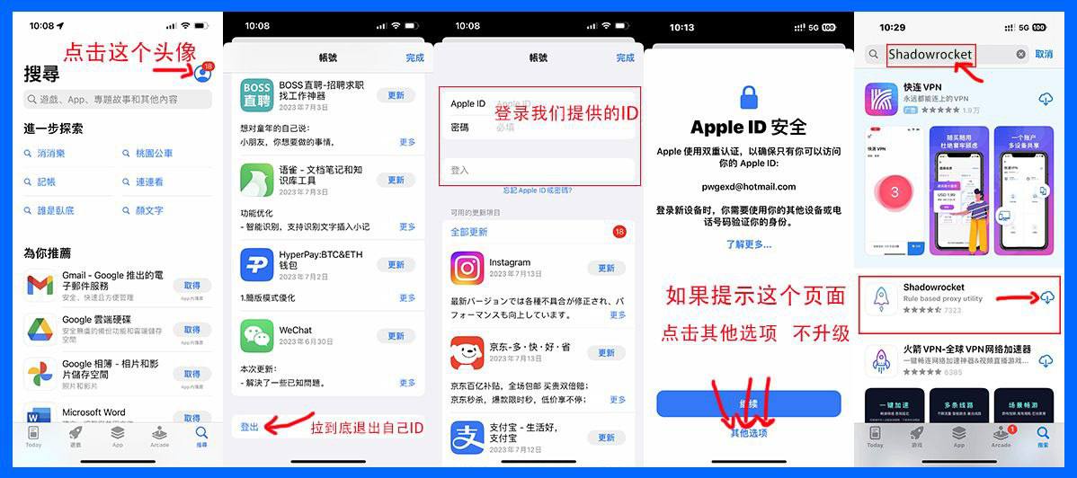 下方是我们共享的已购小火箭的美区Apple ID,大家使用这个账号登录App Store即可免费下载,看下面的图片切换ID及下载软件
