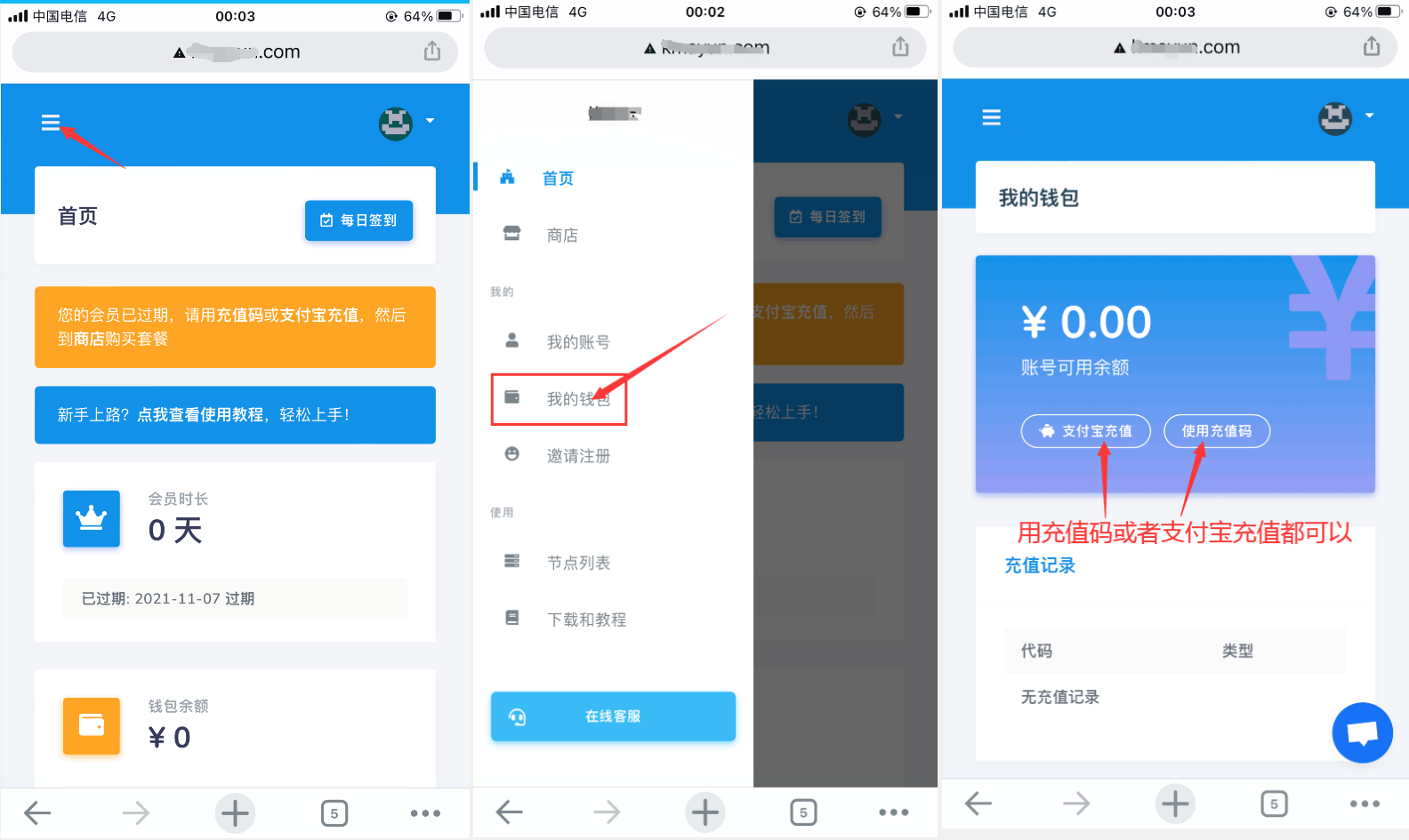 第二步:到我们的网站注册一个账户,先在我的钱包充值,然后再到商店兑换套餐