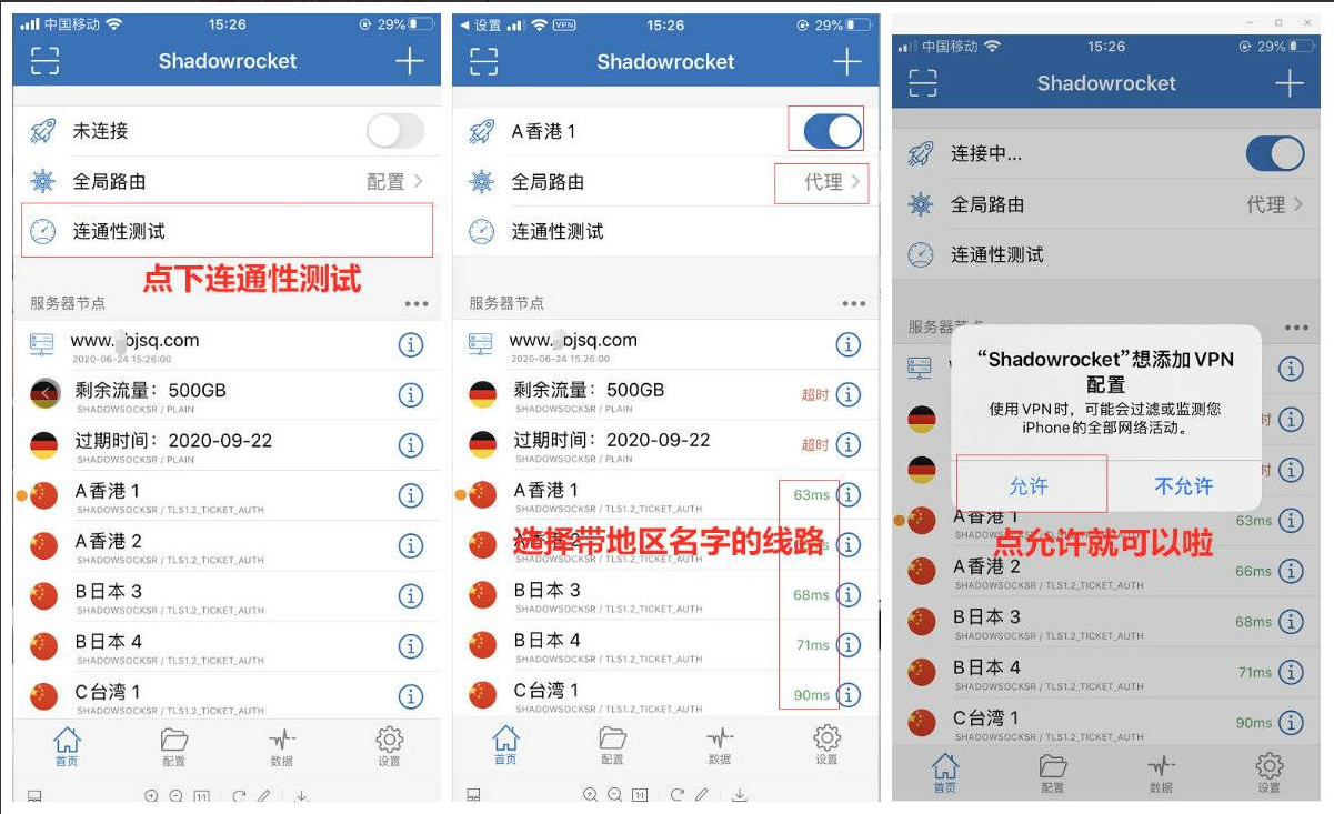添加成功后,1.点下连通性测试 2.然后全局路由配置改成代理 3.选择带地区名字的节点 4.打开右上角开关就可以使用 5. 第一次使用会弹出允许权限点允许就可以了