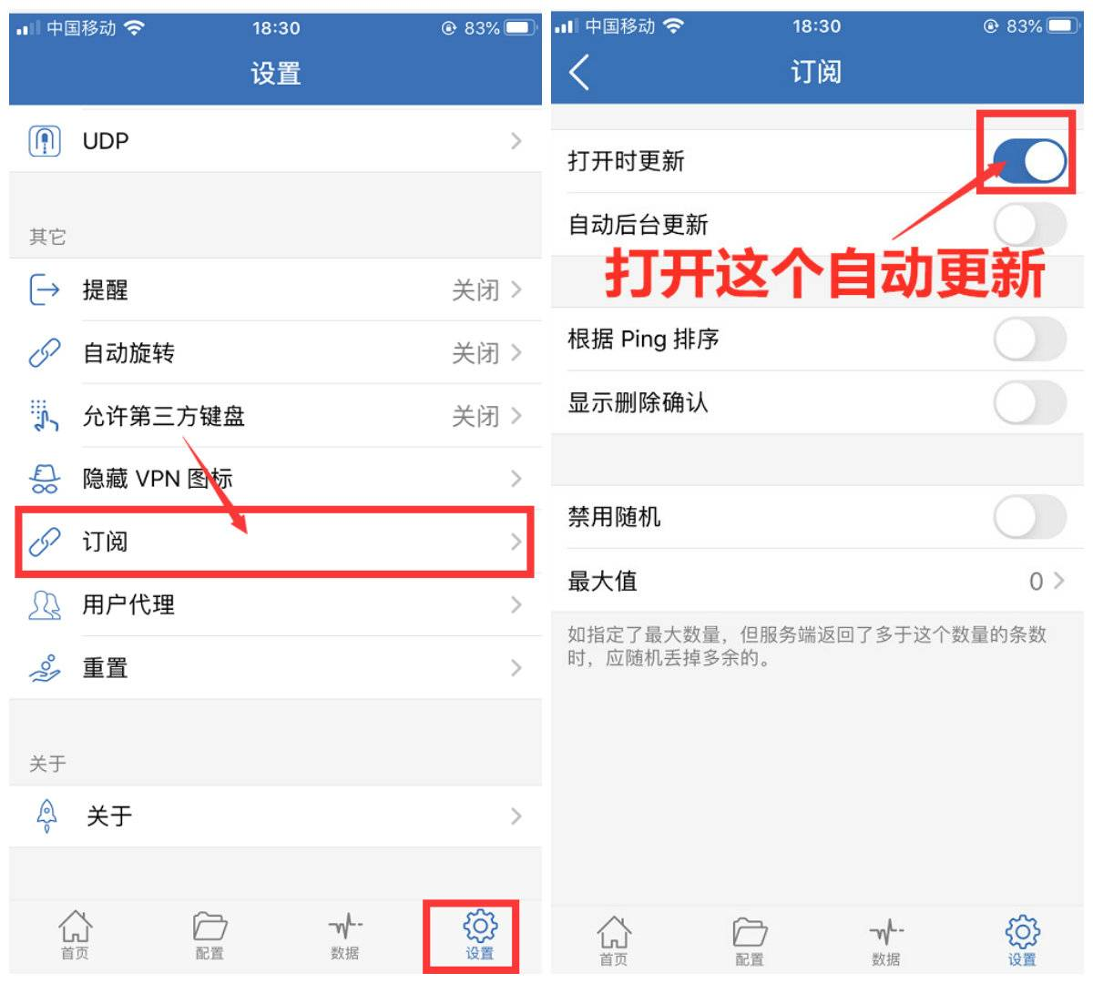 第四步:打开自动更新开关,方便后期线路出问题了会自动更新,每次更新成功记得点下连通性测试再连,显示更新失败也不会影响使用